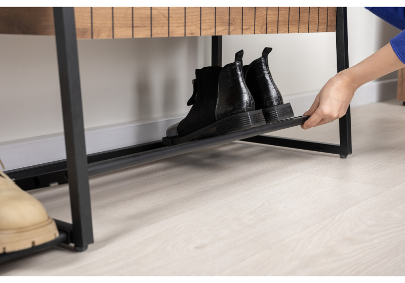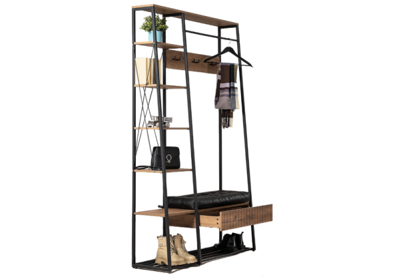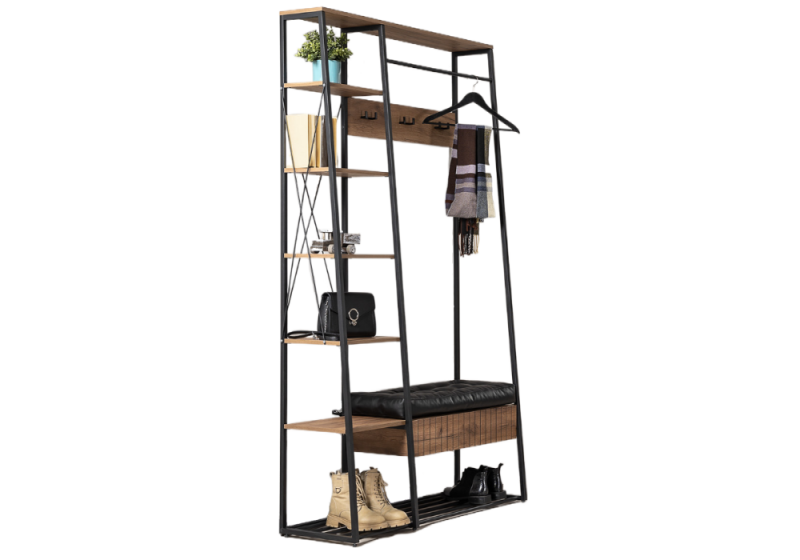 Металлические стойки, открытые полки, крючки Один выдвижной ящик на направляющих скрытого монтажа с доводчиками. Сиденье с мягким элементом из кожзама, съёмная металлическая полка для обуви. ЛДСП 16 мм.